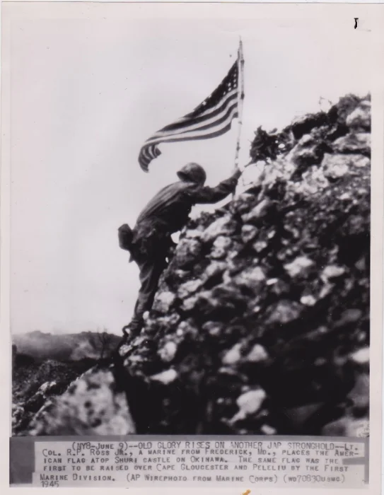 American Flag raised on Okinawa, 1945; printed 1945 (w-14-0808)